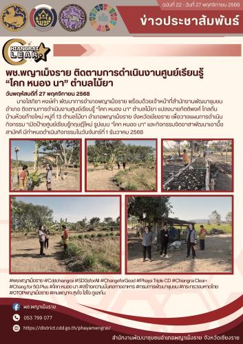 นางโสภิชา หงษ์คำ พัฒนาการอำเภอพญาเม็งราย พร้อมด้วยเจ้าหน้าที่สำนักงานพัฒนาชุมชนอำเภอ ติดตามการดำเนินงานศูนย์เรียนรู้ “โคก หนอง นา” ตำบลไม้ยา แปลงนายกิตติพงศ์ ไกลถิ่น บ้านห้วยก้างใหม่ หมู่ที่ 13 ตำบลไม้ยา อำเภอพญาเม็งราย จังหวัดเชียงราย เพื่อวางแผนการดำเนินกิจกรรม “เปิดป้ายศูนย์เรียนรู้ทฤษฎีใหม่ รูปแบบ “โคก หนอง นา” และกิจกรรมจิตอาสาพัฒนาเอามื้อสามัคคี มีกำหนดดำเนินกิจกรรมในวันจันทร์ที่ 1 ธันวาคม 2568