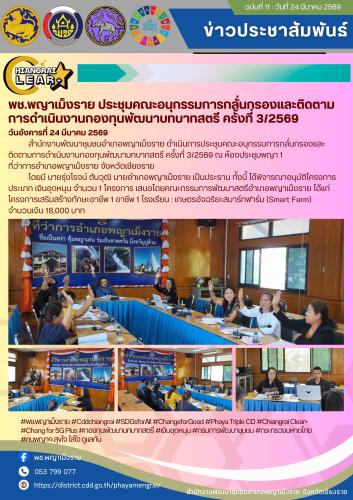 โดยมี นายรุ่งโรจน์ ตันวุฒิ นายอำเภอพญาเม็งราย เป็นประธาน ทั้งนี้ ได้พิจารณาอนุมัติโครงการ ประเภท เงินอุดหนุน จำนวน 1 โครงการ เสนอโดยคณะกรรมการพัฒนาสตรีอำเภอพญาเม็งราย ได้แก่ โครงการเสริมสร้างทักษะอาชีพ 1 อาชีพ 1 โรงเรียน : เกษตรอัจฉริยะสมาร์ทฟาร์ม (Smart Farm) จำนวนเงิน 18,000 บาท
